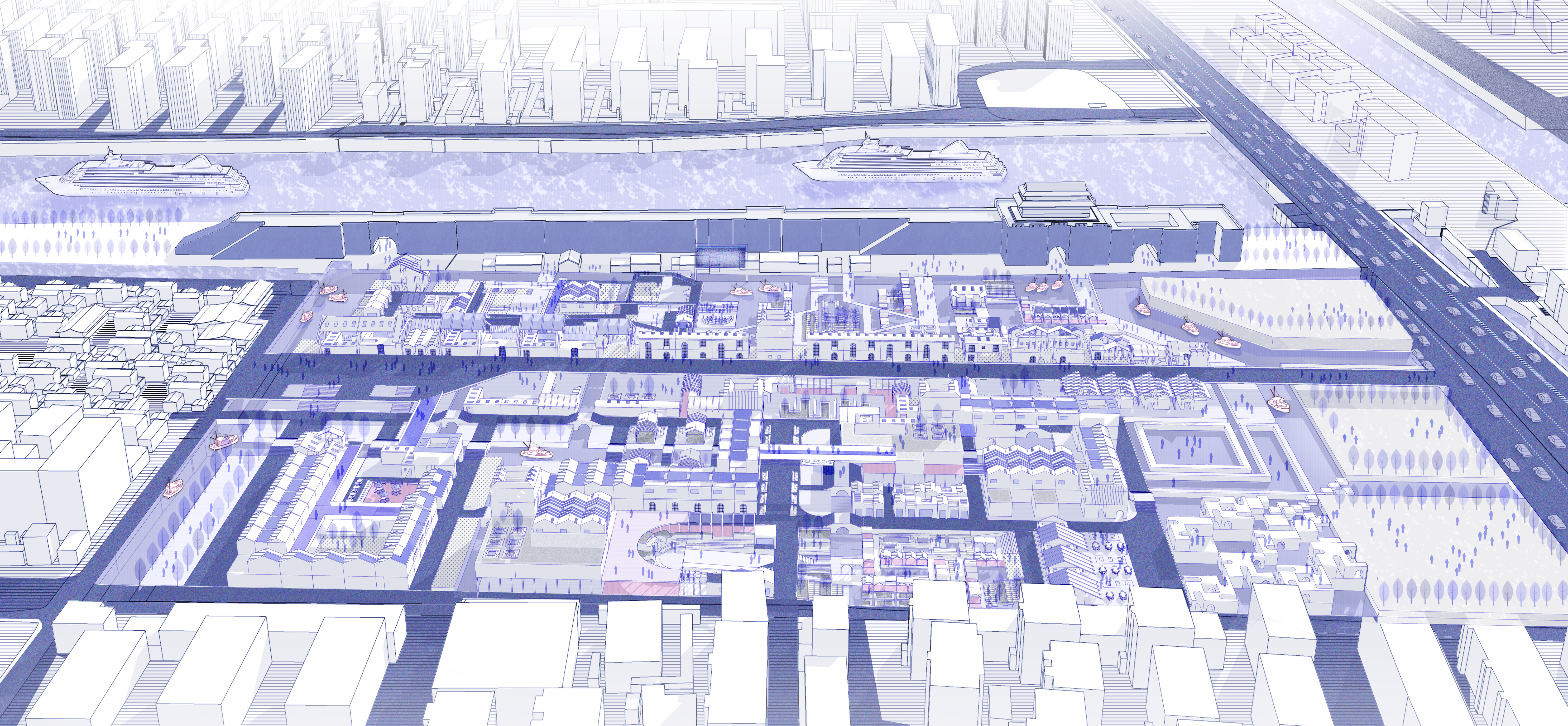 Taking the surrounding environment as the limitation factors, the streamline, function, and spatial layout of the site are generated. The proposal of seven thematic clusters aims to create a dynamic and inclusive community that transitions from a neighborhood setting to a bustling tourism hotspot. The left axonometric drawing clearly illustrates the delineation of water networks, designated boat routes, and docking points, as well as activities and programmes based on the characteristics of the surrounding population and regions. The overall circulation is established to guide pedestrian flow and determine the spatial relationships between different clusters, both at the ground and second-floor levels. Lastly, it creates adaptable building masses that integrate water and road networks.