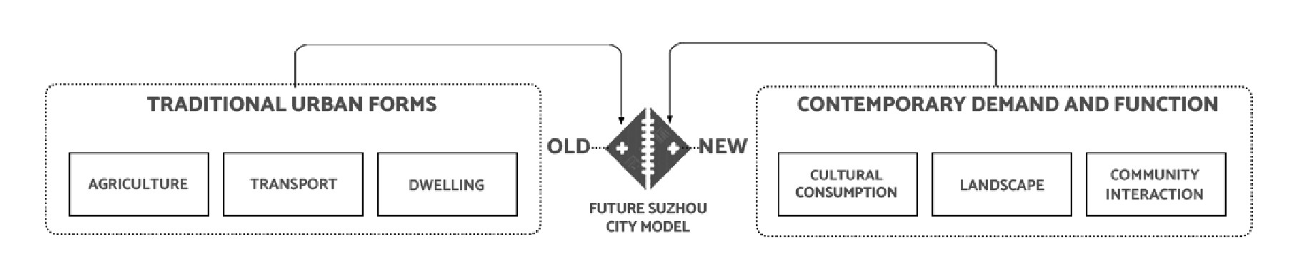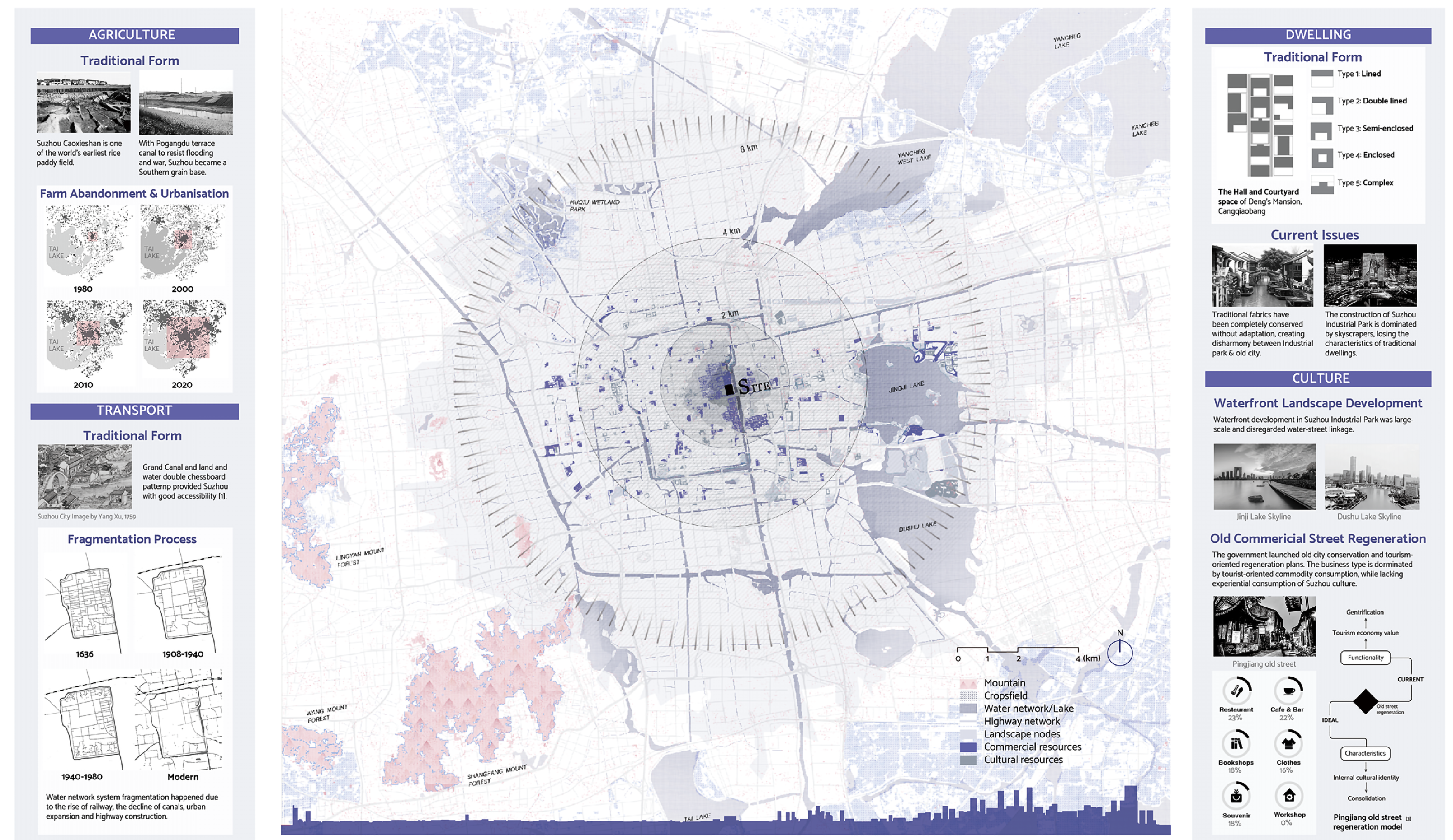 This project attempted to reconcile the conflicts between the preservation and redevelopment of old city legacies. Suzhou's unparalleled historic and aesthetic values are reflected in the built environment. However, rapid urbanization has brought issues of polder field abandonment, water network fraqmentation, and social-spatial segregation between the well-preserved core and highly modernized peripheries.