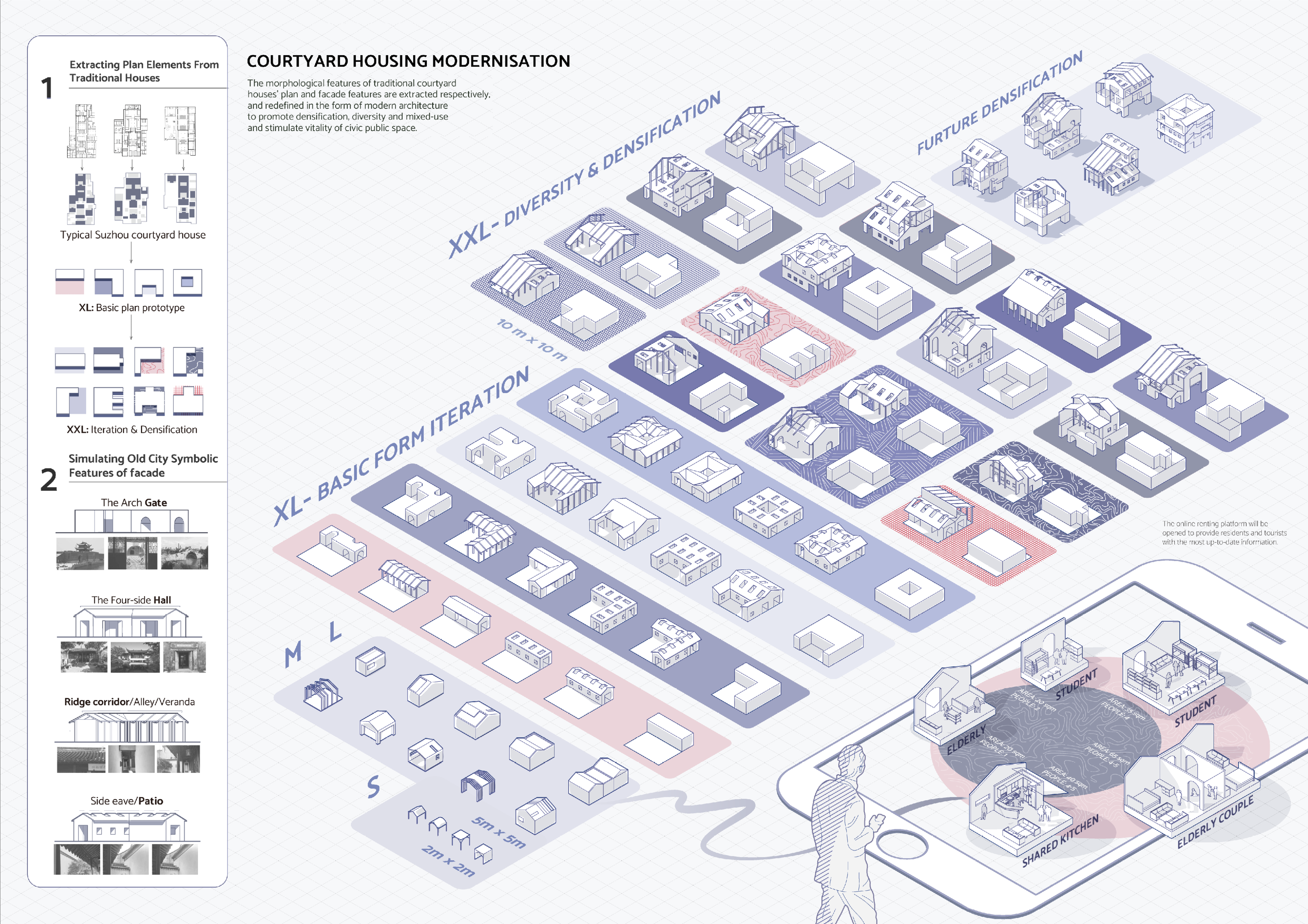 This section deconstructs the morphological features of traditional courtyard houses, focusing on the plan and facade elements. The four basic courtyard house plans (lined type, "L" type, semi-enclosed type, enclosed type) and their eight variants are extracted and redefined in the form of modern architecture. Similarly, the architectural facades are built upon the overlapping of four basic elements: the arch gate, the four-side hall, ridge corridor/alley/veranda, and side eave/patio. These design elements are combined to create units of varying sizes (from 2m2m to 10m10m), suitable for public spaces or housing, with the flexibility to accommodate future densification and floor additions.