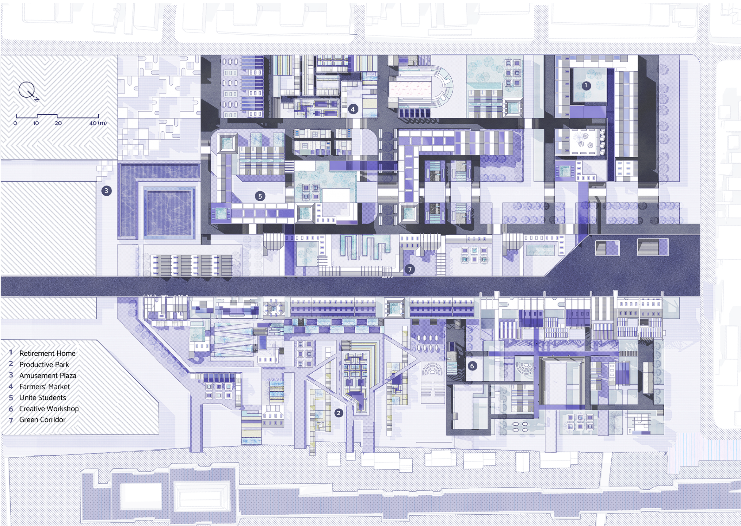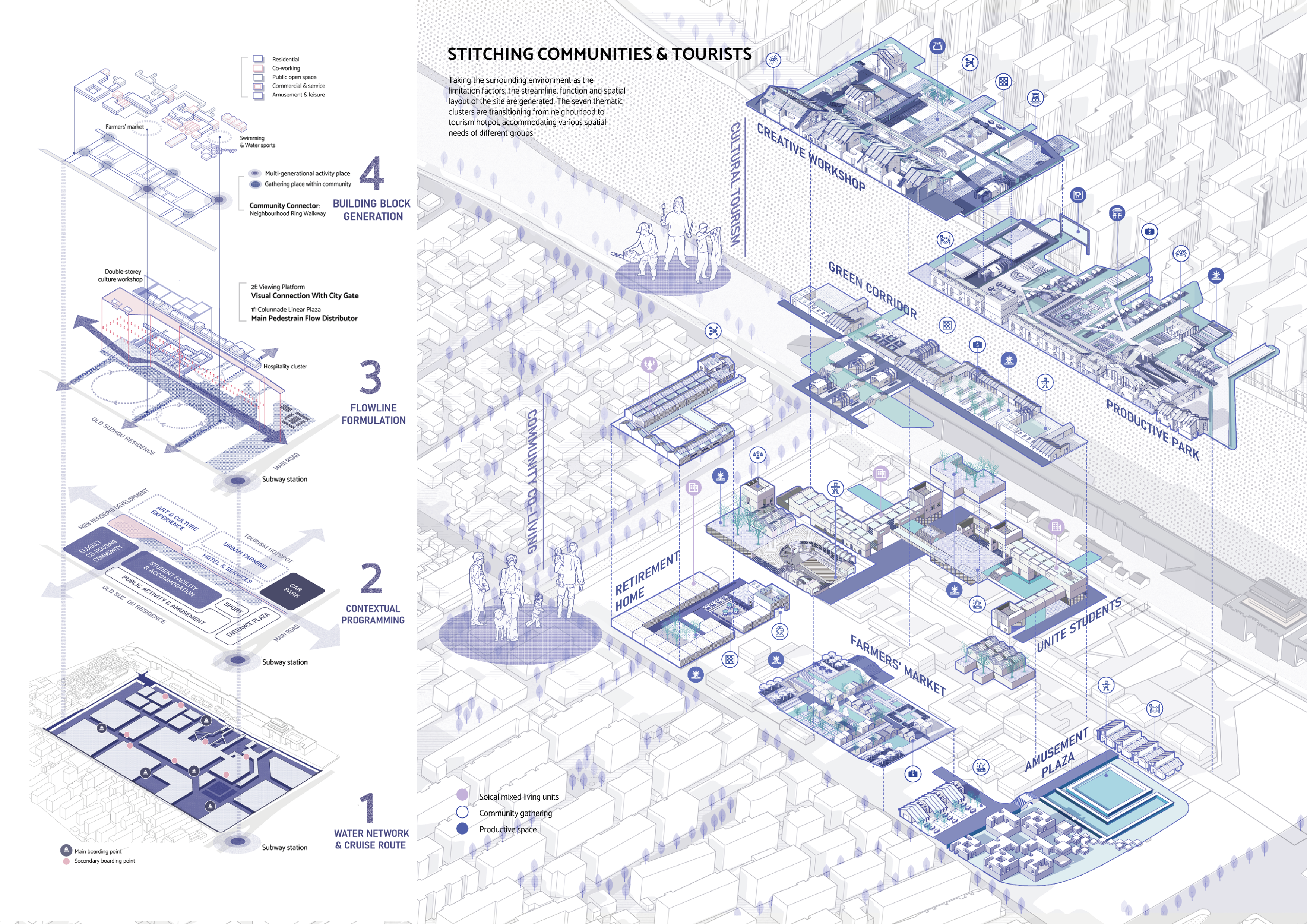 Tourist and local assets at the old city boundary can be used to as the stitches. The morpholoqical features of agriculture, transportation, and housing in Suzhou's old city are reconfiqured into contemporary forms. Based on the demand space of diverse social groups, a masterplan and seven thematic clusters are designed to promote physical and social connection and engage local communities.