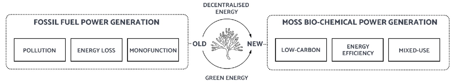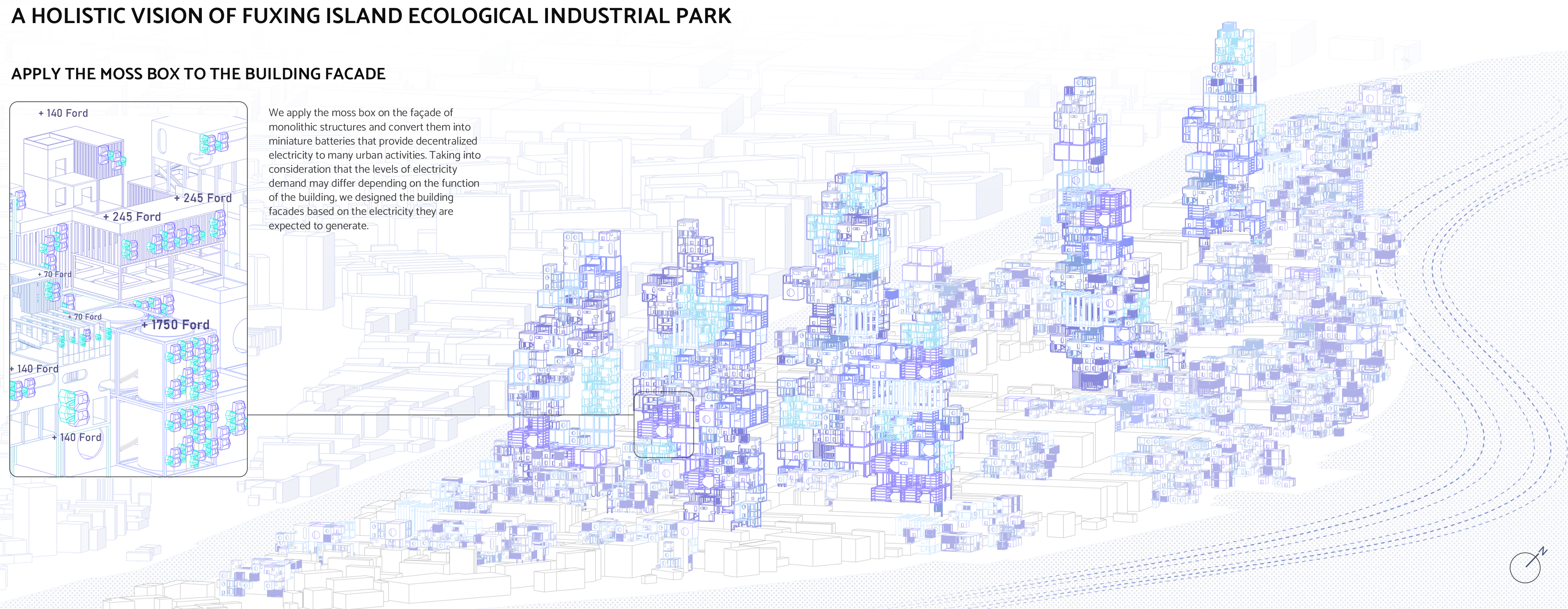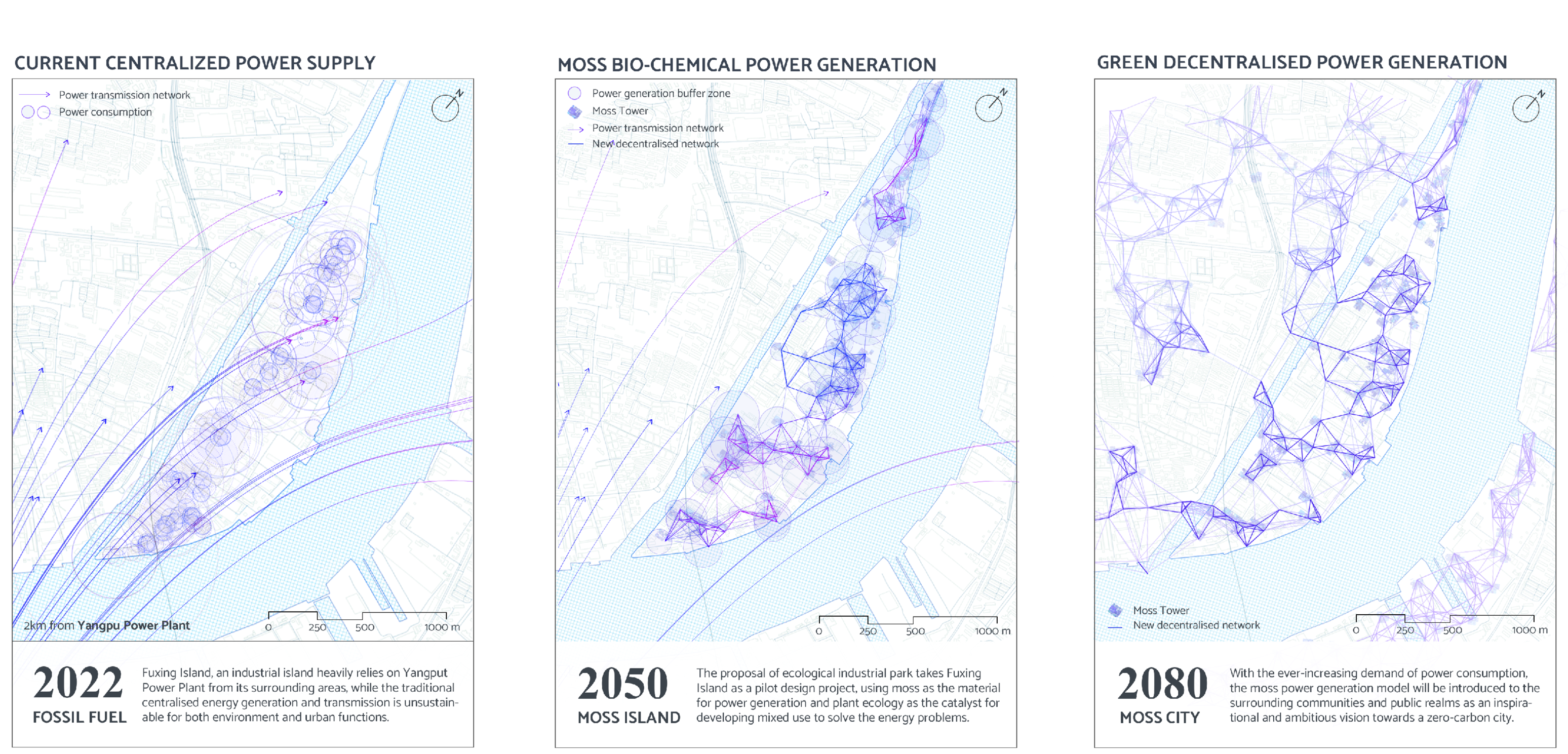 In 2022, Fuxing Island relied heavily on the Yangpu Power Plant for its energy needs, but the conventional centralized energy generation and transmission methods proved unsustainable for the environment and urban functionality. Our proposal envisions Fuxing Island as a pioneering ecological industrial park by 2050, where moss serves as a material for power generation and plant ecology acts as a catalyst for diverse development, effectively addressing the energy challenges. Looking ahead to 2080, as power consumption continues to rise, we propose the introduction of the moss power generation model to the surrounding communities and public spaces, presenting an inspiring and ambitious vision towards achieving a zero-carbon city.