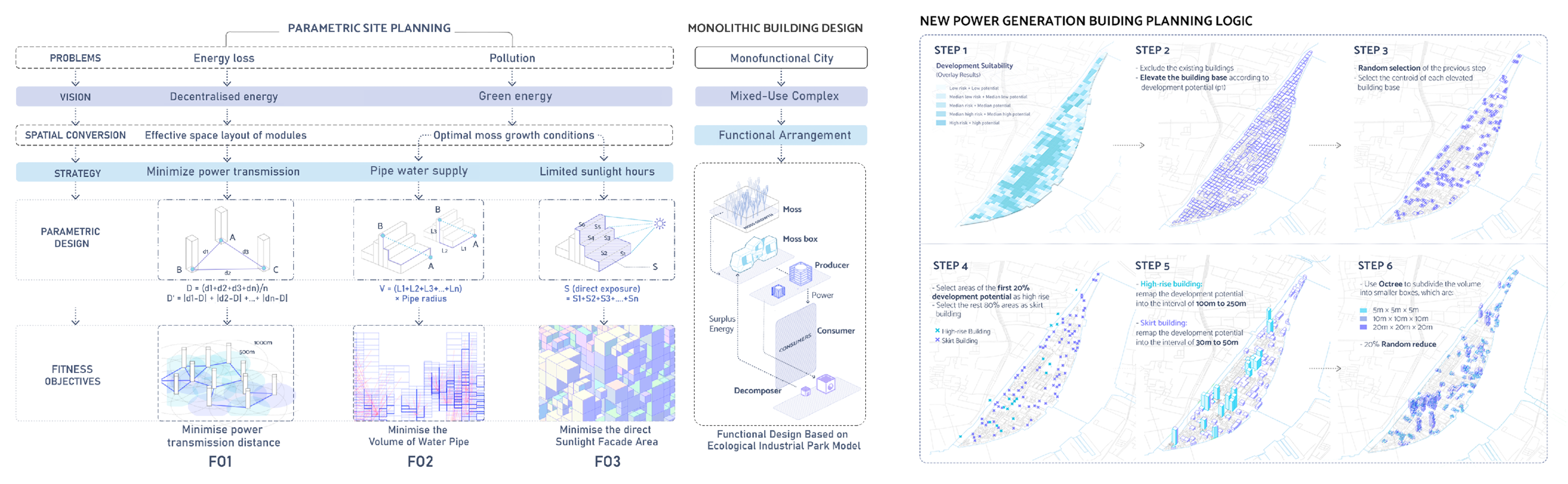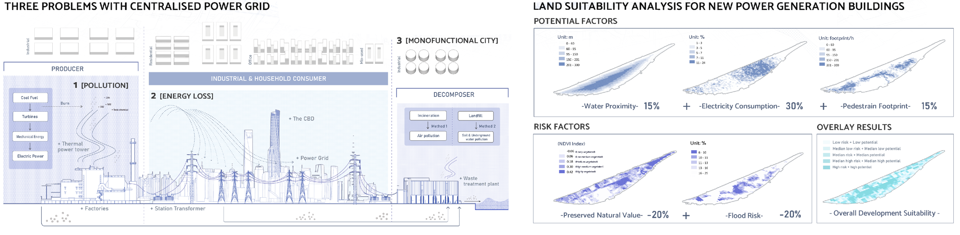 Fuxing lsland has been built upon a power system centered around Yangpu Power Plant. Growing electricity demand led to excessive local coal burning, generated huge pollution, and forced residents and urban services to move. ln response to these issues,we used biochemical energy as a fuel and parametric design as a tool to construct a decentralized power generation model and transform Fuxing lsland into a green and mixed-use industrial park.