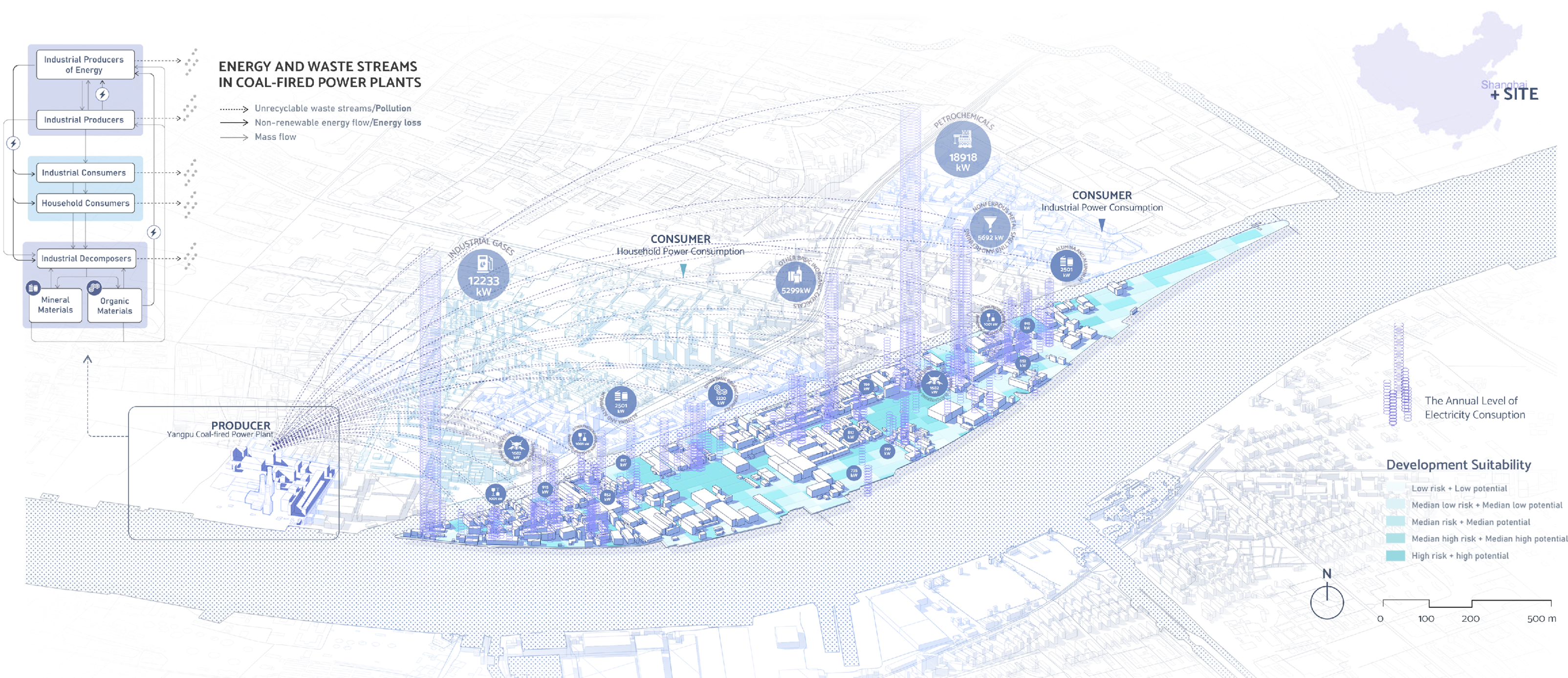 Shanghai's Fuxing Island grapples with surging electricity consumption, prompting the coal-fired Yangpu Power Plant to bolster its power generation capacity, leading to a surge in pollutant emissions. In the realm of coal-based power generation, non-renewable energy sources and unrecyclable waste streams serve as primary energy inputs. Consequently, not only power plants, as producers, but also industrial and household consumers contribute to pollution emissions when utilizing electricity. Industrial decomposers, often referring to waste treatment plants employing landfill and incineration methods, further emit pollutants during the decomposition of mineral and organic materials. Moreover, the implementation of centralized power grids and thermal power towers gives rise to energy transmission losses and fosters uniform urban landscapes marked by the segregation of residential and industrial zones. These developments engender ecological and social complexities on Shanghai's Fuxing Island.