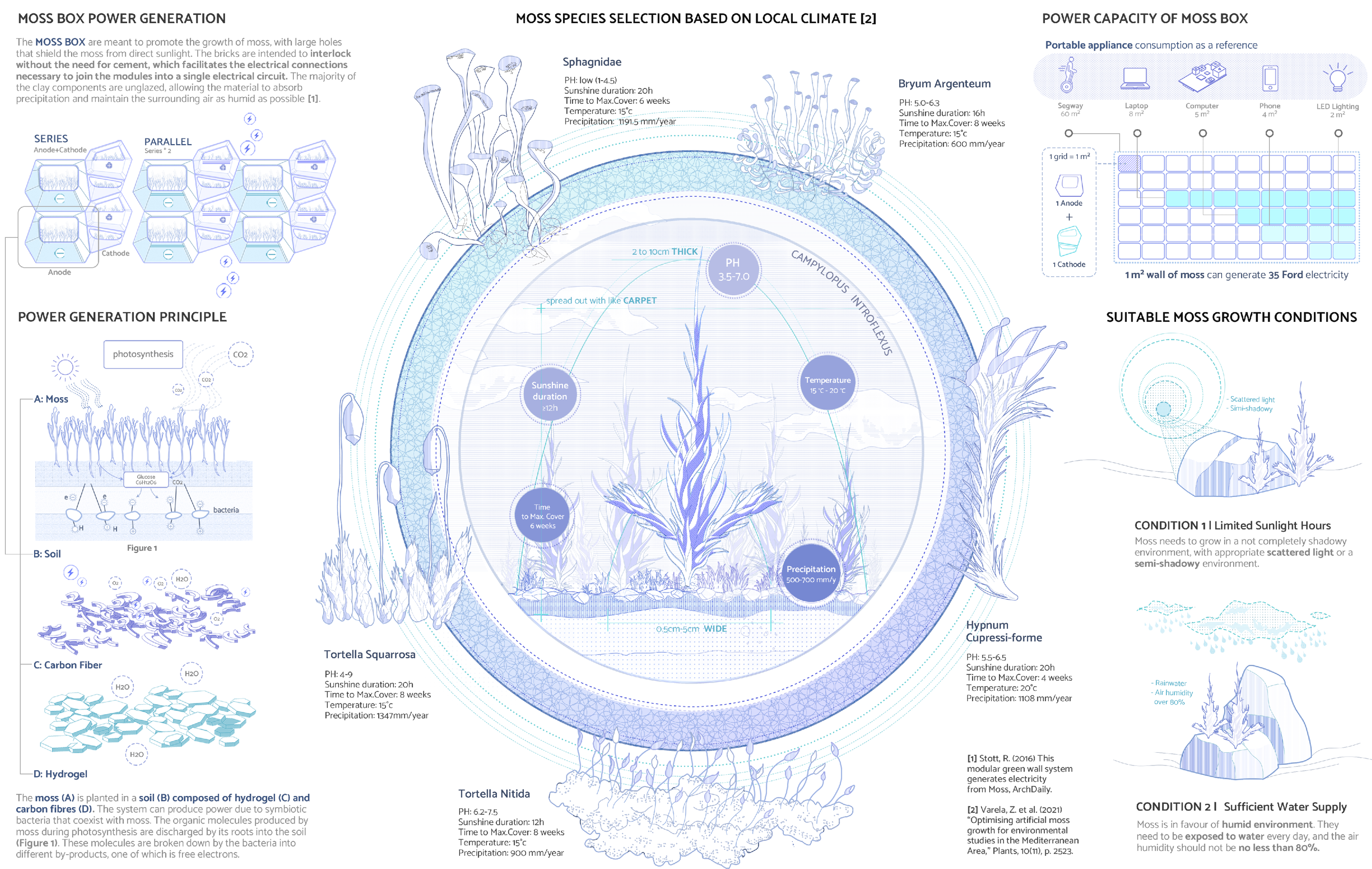 To determine the most suitable moss species for Fuxing Island, we conducted an in-depth study of Shanghai's climatic conditions, focusing on sunlight duration, temperature, and precipitation. Based on our analysis, Campylopus Introflexus emerged as the ideal moss species for cultivation. Additionally, we assessed the power capacity of moss boxes, referencing portable appliance consumption. A 1 m² moss wall can generate 35 Ford electricity, while a 60 m² moss wall has the capacity to fully charge a scooter, power seven laptops, fifteen mobile phones, and thirty LED bulbs simultaneously.