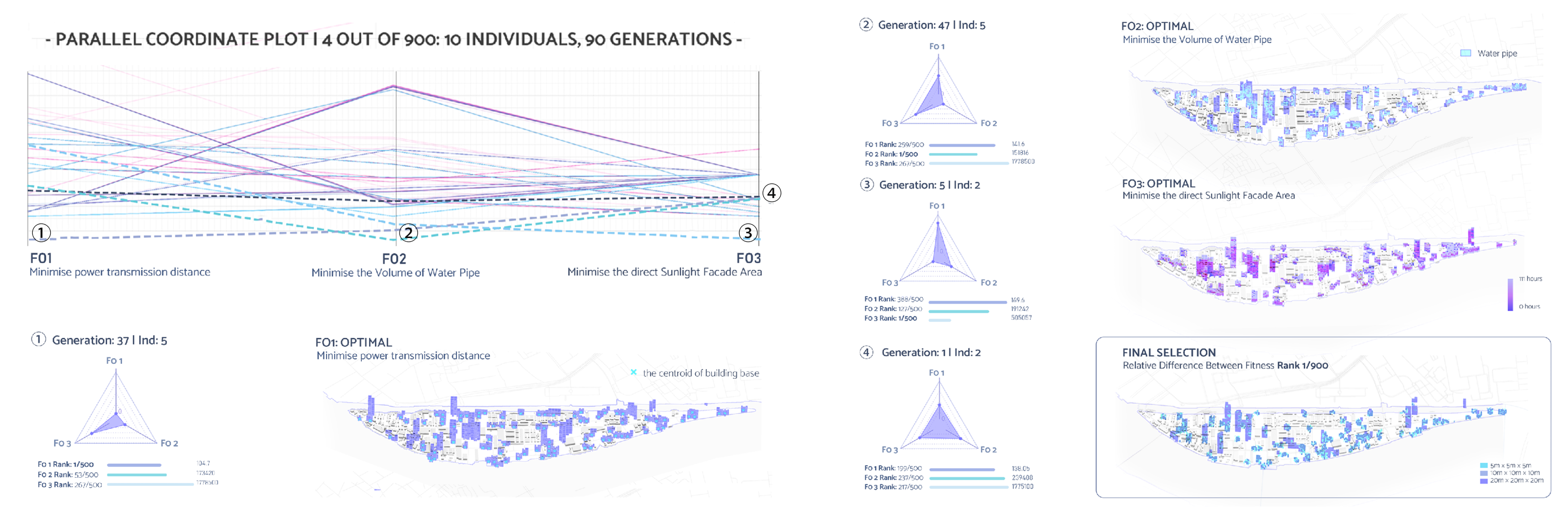 In this phase, we employed Wallacei to parametrize the site planning process, setting three optimization objectives. Through phenotype generation, we simulated 900 individuals across 90 generations. Our selection criterion focused on minimizing relative differences among the three fitness objectives, aiming to strike a balance between optimal conditions. Wallacei proves invaluable in driving effective decision-making by leveraging evolutionary simulations and enabling users to achieve desired outcomes in their design endeavors.