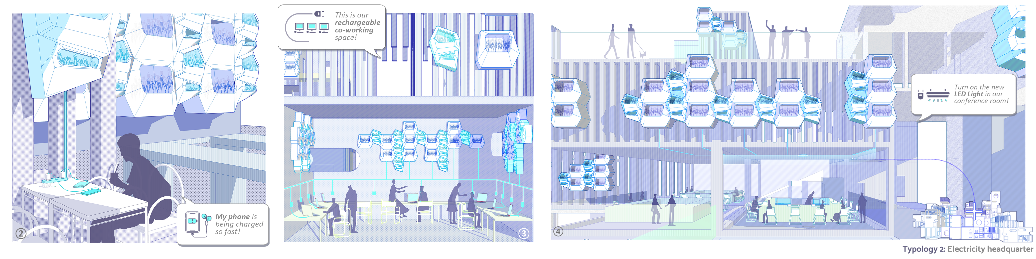 Within our ecological industrial park, the moss electricity headquarters acts as a primary producer, providing supplementary power to other producers. Cellulose and hydrogel manufacturers supply the necessary materials for moss box production and maintenance throughout the entire industrial park. Consumers also form a circular system, with large-scale research agents, medium-scale financial and trade agents, and small-scale co-working offices providing employment opportunities for residents, students, researchers, office workers, and tourists. Various retail units offer life facilities, contributing to the vibrancy of the industrial park. The public spaces primarily serve as a waterfront promenade, generating funds for the park's development as a supportive measure for real estate projects. The social interactions within these spaces facilitate the dissemination of knowledge among developers and maintainers of the moss ecosystem, indirectly driving the prosperity of the industrial park. These functional elements are locally clustered in a random manner and globally dispersed, creating density and diversity of use within the limited space, all supported by decentralized power generation modules.