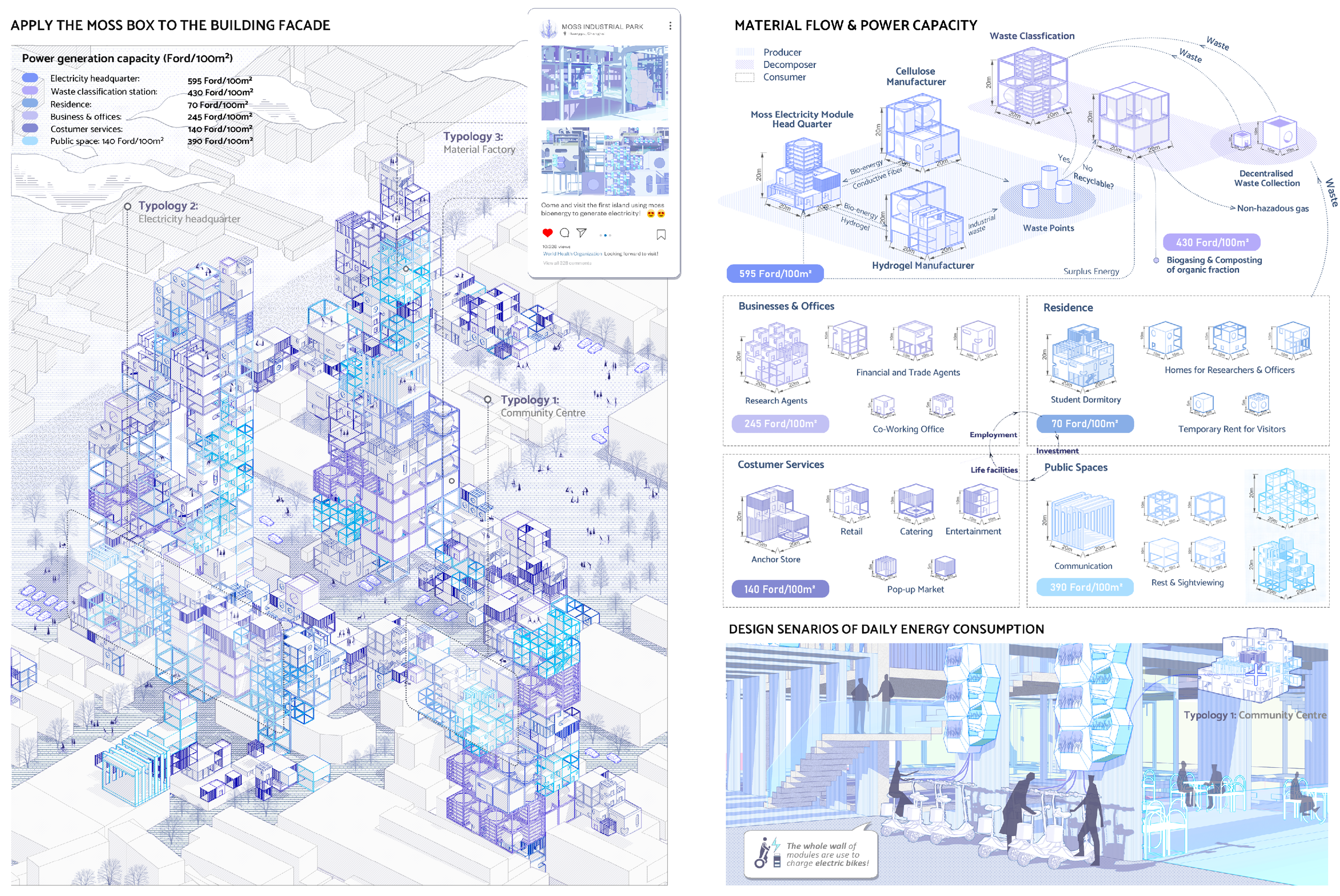 In line with our ecological industry model, the monolithic building design incorporates modular moss boxes as electricity infrastructure, enabling the recycling of waste as surplus energy and new materials. These functional arrangements aim to transform the monofunctional island into a dynamic mixed-use industrial complex, effectively breaking down the segregation between commercial, residential, and industrial land uses.