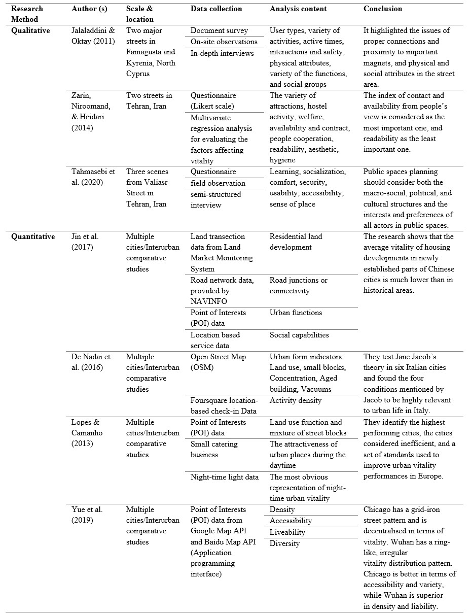 In the new digital era, a systemic framework plays a crucial role in assessing the status quo and underlying patterns of urban vitality. Many scholars link contemporary urban issues to early place-making theories, employing a variety of indicators to quantify urban planning and design elements and discussing local adaptation through Jacobs's or Lynch's eyes (De Nadai et al., 2016; Li et al., 2022; Suils et al., 2018; Pakoz, Yaratgan, and ahin, 2022). The features of urban space have been deconstructed into multitudinous dimensions, and urban vitality has been interpreted as map overlays of economic, social, and environmental indicators, mainly through ArcGIS. New data and tools allow researchers to shift their focus from locality to mobility and policy transfer at interurban, intraurban, and international scales (Long and Huang, 2017; Liu et al., 2014), and many of them have identified and compared key factors of urban vitality and made relevant land use and urban design recommendations for different city regions. The two branches of research, qualitative and quantitative, manifest huge differences in scales, data collection, analysis contents, and conclusions, as shown in Table 1.