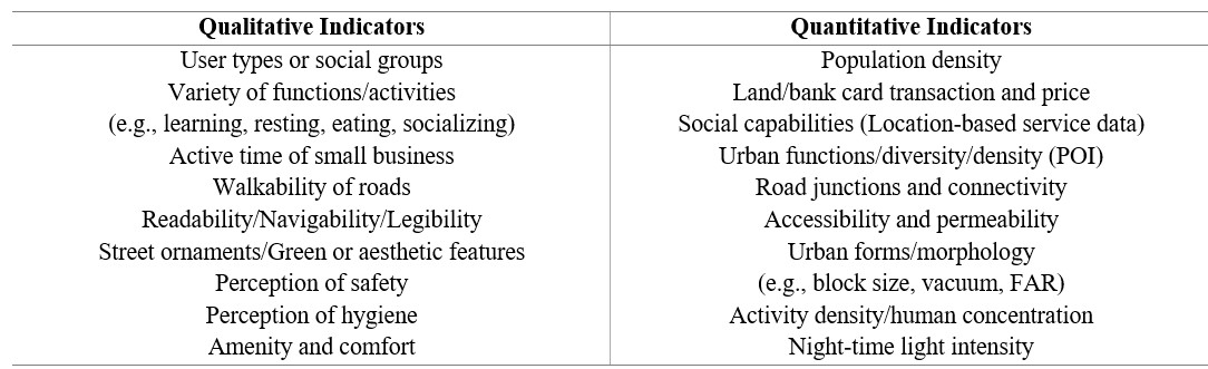 A diverse set of indicators serves as the backbone of both qualitative and quantitative urban vitality measurements (Table 2). Qualitative data typically express micro-scale economic, social, and cultural features, such as user types, active times, social functions, welfare and safety, aesthetics, comfort, hygiene, and the "sense of place" (Zarin, Niroomand, & Heidari, 2014; Tahmasebi et al., 2020). Quantitative data covers a wide range of geo-demographic and socio-economic dimensions, from population density to land prices (Jin et al., 2017), bank card transactions (Kim, 2018), and small business services (Ye et al., 2017). It also measures accessibility and location (Li et al., 2022) and morphological features including block type, building ages and heights, road junctions, and street width (De Nadai et al., 2016; Long and Huang, 2019).