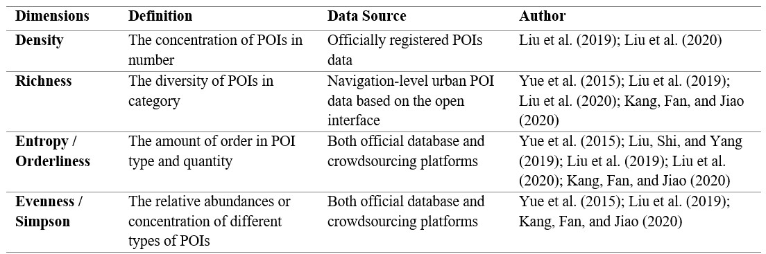 The superiority of POI data entails its wide usage as a proxy for "land use" in urban vitality research, where POI have been employed to evaluate land mix use (Lopes & Camanoho, 2013; Yue et al., 2017), urban functions (Jin et al., 2017), facilities (Li et al., 2022; Wu et al., 2021), accessibility (Yue et al., 2019), liveability (Zeng et al., 2018; Long and Huang, 2017), and small (catering) businesses (Ye al., 2017). These studies often deconstruct the connotation of POIs into multiple indicators to assess the density, richness, orderliness, and evenness of urban land use (Table 3). A numeric result of "land use diversity" was generated as a composition of these indicators and proved to be positively correlated to urban vitality.