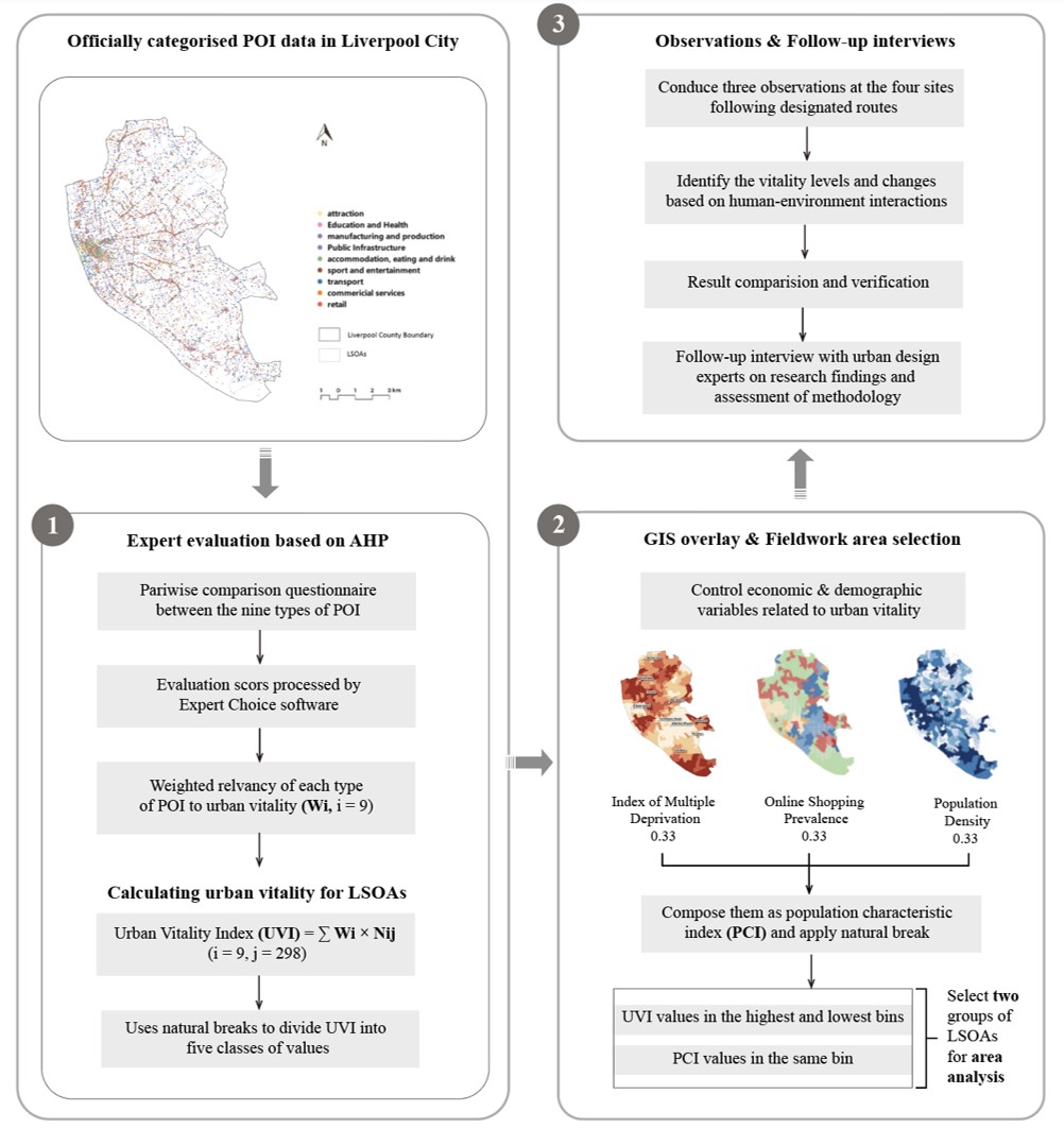 This paper selects the City of Liverpool as the case study area. Chapter 2 provides a review discussing the theories, methods, and data used for urban vitality measurement, which lays the theoretical foundation and further guides the methodology. Evaluating existing frameworks helps identify gaps and limitations to best position this paper within the context of mixed-methods research. Chapter 3 follows the four-stage conceptual framework, starting with an expert evaluation that draws POI types in relation to urban vitality and concluding with a hypothetical distribution of vitality in the City of Liverpool based on ArcGIS. Chapter 4 undertakes field observation in three representative case study areas, attempting to identify the consistencies and mismatches between the hypothesis and reality. This exploration allows for a critical and comprehensive response to the research questions by assessing the methods used for data acquisition, analysis, and interpretation. Linked the findings back to the literature, this paper seeks to make sound recommendations regarding how this mixed-methods paradigm would contribute to future studies on urban vitality.