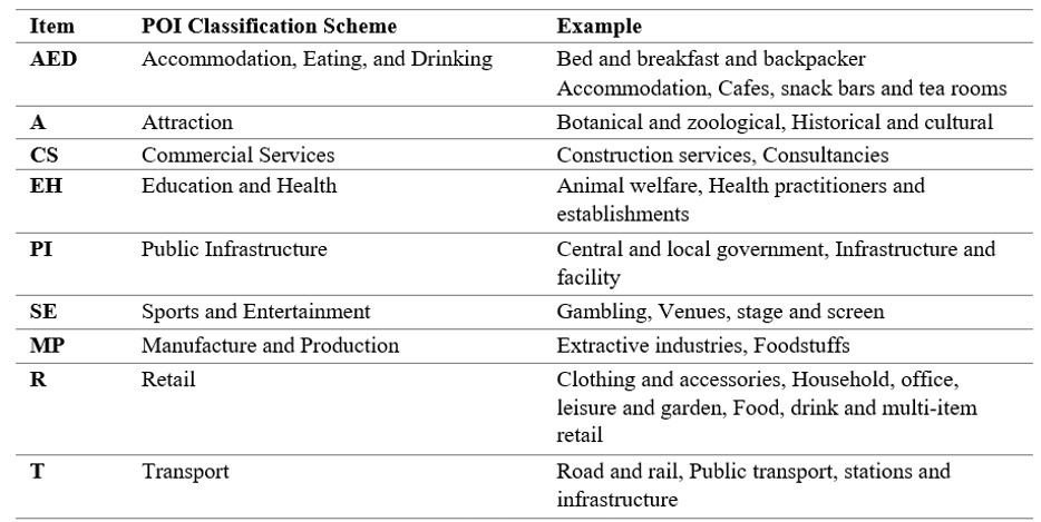 In this study, POI data serves as a proxy for urban vitality. Generally, POI data derives from two types of sources: crowdsourcing platforms and big-tech firms (Psyllidis, 2022). Although volunteer-based geographic information (VGI)-based POIs can best generate a nowcasting, "always-on" open-source observatory of human activities (Lazer and Radford, 2017) and can be readily auto-categorised (Liu and Long, 2015), there have been significant problems such as data completeness, correctness, and taxonomy (Yue et al., 2015). Thus, the POI dataset used in this analysis is provided by Ordnance Survey (2022), an officially registered product with a three-hierarchy classification scheme. As systematic and intuitive design of POI classification is essential for POI data use for urban research (Jiang et al., 2015), the Level 1 nine groups of POIs (Table 3.1) were selected as the study materials. Adopting the broadest and simplest POI categorization allowed for an appropriate level of detail while also avoiding dealing with too much complexity in later pairwise comparisons (Chapter 3.3.1.). Regrettably, this study did not exclude services marked as "permanently closed" on Google Maps from the dataset.