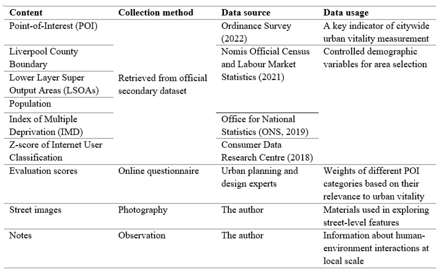 Apart from POI data, all the location-tagged quantitative data were retrieved from online databases, using NUTS-3 Liverpool County as the boundary and LSOAs as geographic containers. Street images and writing notes used for qualitative analysis were collected by the author during the site visits. The data contents, collection methods, data sources, and usages are detailed in Table 3.2.