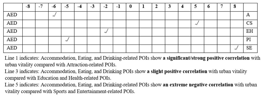 Synergistic Effects of POIs:It is worthwhile noting that the synergistic effects generated by functional mix may contribute to urban vibrancy in a non-linear way. Synergism means that collaboration or interaction between the components usually causes a greater overall effect than the aggregated individual contributions (Corning, 2003). In Section 3.3.2, we assumed UVI as the aggregated values of the weights of individual POIs. This may underestimate the UVI in Case 1 while overestimating it in Case 2. Bertolini (1999) proposed the "node-functionality-place" theory, arguing for mutually beneficial relations between transport facilities, walking environments, and land development. Xiao et al. (2021) used this theory to explain why certain types of POI configuration are more pertinent to a higher vitality level, such as the agglomeration of retail and shopping destinations (Psyllidis, 2022). For example, in Case 1, a shopping mall located nearby a small pedestrian garden with food supplies can provide numerous leisure and entertainment opportunities beyond shopping itself and dramatically boost the area’s vitality. While in Case 3, a bus stop next to several health agencies may obtain similar UVI on the GIS map, they are less likely to attract a similar amount of footfall in the actual situation.