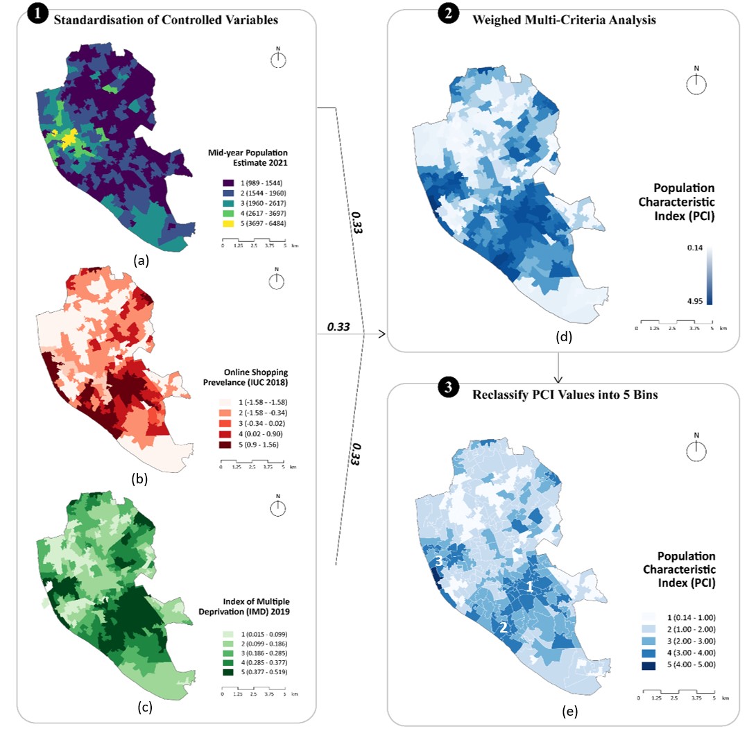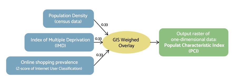The above results set conditions for case study area selection. Three variables with a significant impact on an area’s vitality—population density, the Index of Multiple Deprivation (IMD), and online shopping prevalence—were taken as controlled factors to ensure the discrepancies in urban vitality are primarily relevant to UVI (Roig-Tierno et al., 2013). By assigning them equal weight, the three indicators were composed into one dimension and expressed as the Population Characteristic Index (PCI) (Figure 3.3).