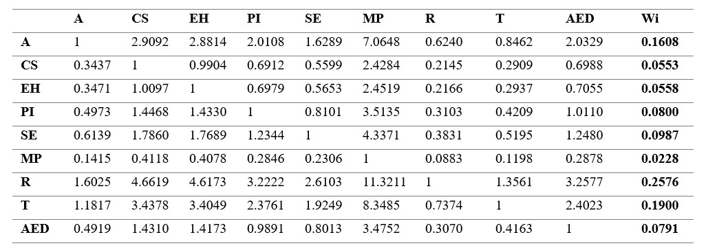 A critical issue of AHP existed in the loss of the interactive character (Locket et al., 1986). This study simplified the consensus-based group discussion process commonly used in AHP for aggregating individual ratings into the calculation of the geometric mean at the final stage (Anders and Muller, 1995).
