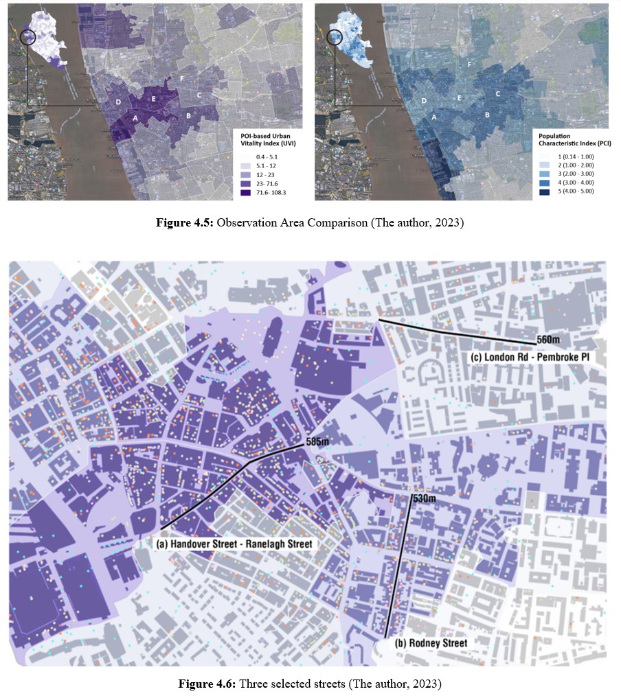 Then it compared two groups of LSOAs compliant with the first two principles in Section 3.3.3 (ABC and DEF in Figure 4.5) against the rest of the criteria. Area C, located in closer proximity to the city centre, stands out as the most functionally diverse area in Liverpool with its design comprising permeable blocks and connected streets and the presence of Liverpool One retail complex. Additionally, it provides easy pedestrian access to adjacent LSOAs with varying UVI levels, enabling a unique urban vitality experience over a short distance. Thus, a decision was made to choose ABC over DEF. According to the last principle, the study narrowed down the observation survey areas to three representative streets: Handover- Ranelagh St., Rodney St., and London Rd - Pembroke Pl (Figure 4.6). These streets bear similar features, such as a length of 500 to 600 meters, the highest density of roadside POIs distribution, and the capacity to accommodate both pedestrians and vehicles.