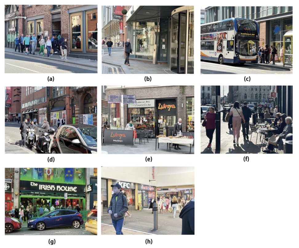 The design of the buildings on the street allowed for multiple uses, resulting in a diverse range of human activities taking place on the sidewalks. Pedestrians moved at a fast pace while engaging in conversation, bringing a constant sense of mobility and vitality to the street. The sidewalk was bustling with activity, as depicted in Figure 4.8a, with people making phone calls, chatting with friends, and waiting for buses (b-d). The street frontages were particularly active during mealtimes, as local specialty restaurants and fast-food chains offered extensive outdoor seating areas (e, f). As almost all the shops remained open until midnight, the street attracted many young people, cyclists, and night runners. With the increasing crowds and musical performances in the evening, bars and fast-food restaurants became the liveliest hotspots (g). The Handover Street became relatively quiet, with nightlife activity being concentrated in the Ranelagh St, particularly with the continual influx of people from Liverpool Central Station (h).