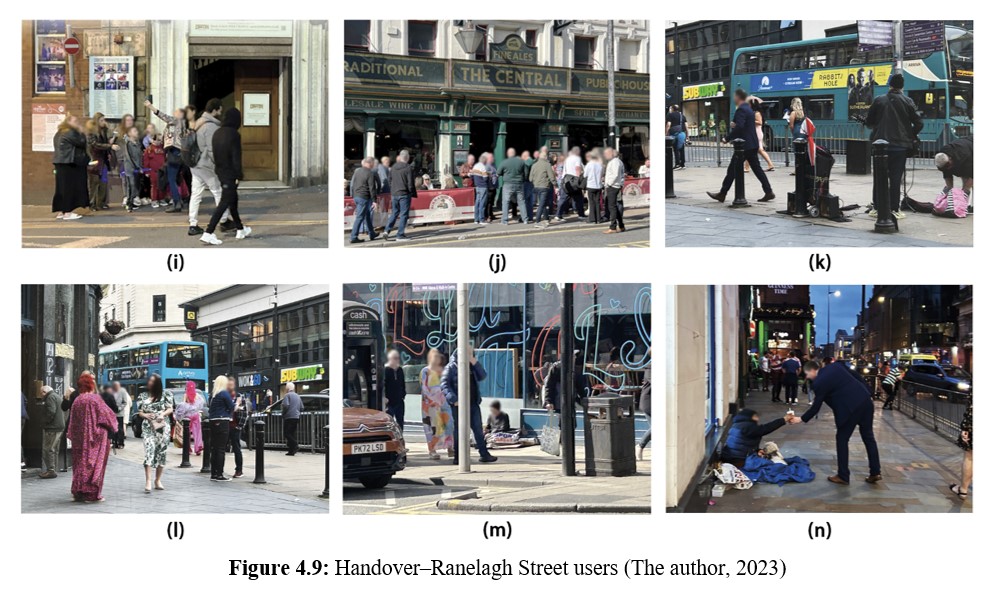 The diverse range of street users was evident in Figure 4.9i, which included shop customers, young couples, university students, families with kids, and the aged population. Local seniors tended to gather around Ranelagh's Tavern, Five Ales, and the Irish House (j). The presence of gambling venues, stages, and screens also attracted skateboarders, artists, and musicians (k). Notably, brightly dressed individuals appeared on the street around 6 p.m., likely due to the close proximity of the opera house (l). Homeless individuals were also present, which served as a testament to the street's high level of vitality (m, n).