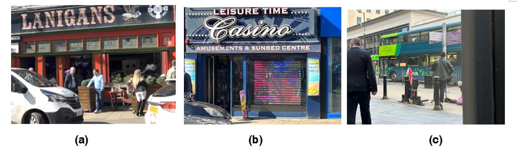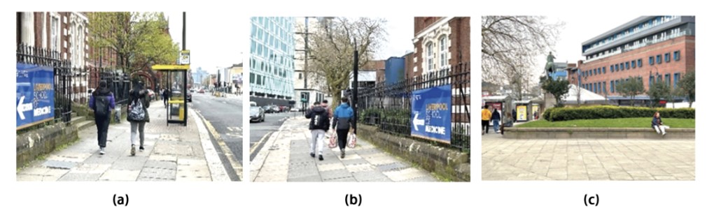 Indeed, the number of passers-by on London Road significantly surpassed those who stayed or entered the buildings (Figure 4.13a, b). We carried out a 20-minute observation at two locations to prove this assumption: 1) the street shops near the intersection of Daulby St. and Pembroke Pl., and 2) Monument Place Square. During the first observation, no pedestrian entered the stops during this interval except one using the ATM; at the second site, only two individuals used the seats in the square (c). Interestingly, TESCO, located at the second site, was found to be the most frequently visited store, with 14 individuals entering it. Although retail POI represents high vitality, shopping activities inside this type of supermarket chain did not contribute to the vitality of the street.