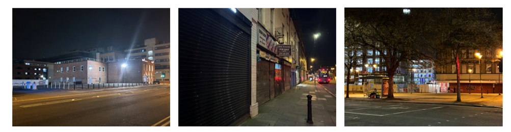 The entire street gave the impression of being “passed through” rather than being "used." Street activities were quite limited, and the only purpose for which the observed people stayed on the street was to wait for buses. Because of the dominance of EH-related POIs, the street users were primarily university students and hospital patients. Compared with the other two sites, there was also a dominant population of ethnic minorities and low-income workers, such as cleaners and wall painters, likely due to the existence of low-end construction, contract, repair, and recycling services. The street shops proved unattractive to most customers. It was observed that many pedestrians carried shopping bags from Lidl, indicating that the street was frequently used as a quick pass rather than a lingering place. As night fell, the streets were almost empty of pedestrians, with bus stops, squares, and parking lots completely vacant (Figure 4.14). Significantly, most retailers closed before 8:00 p.m., of which one-third closed at non-holiday 2 p.m. Street lighting was insufficient, and the low publicity of the building facades added to the intense feeling of unease and insecurity. Overall, the night-time scene was eerily quiet and unsettling.
