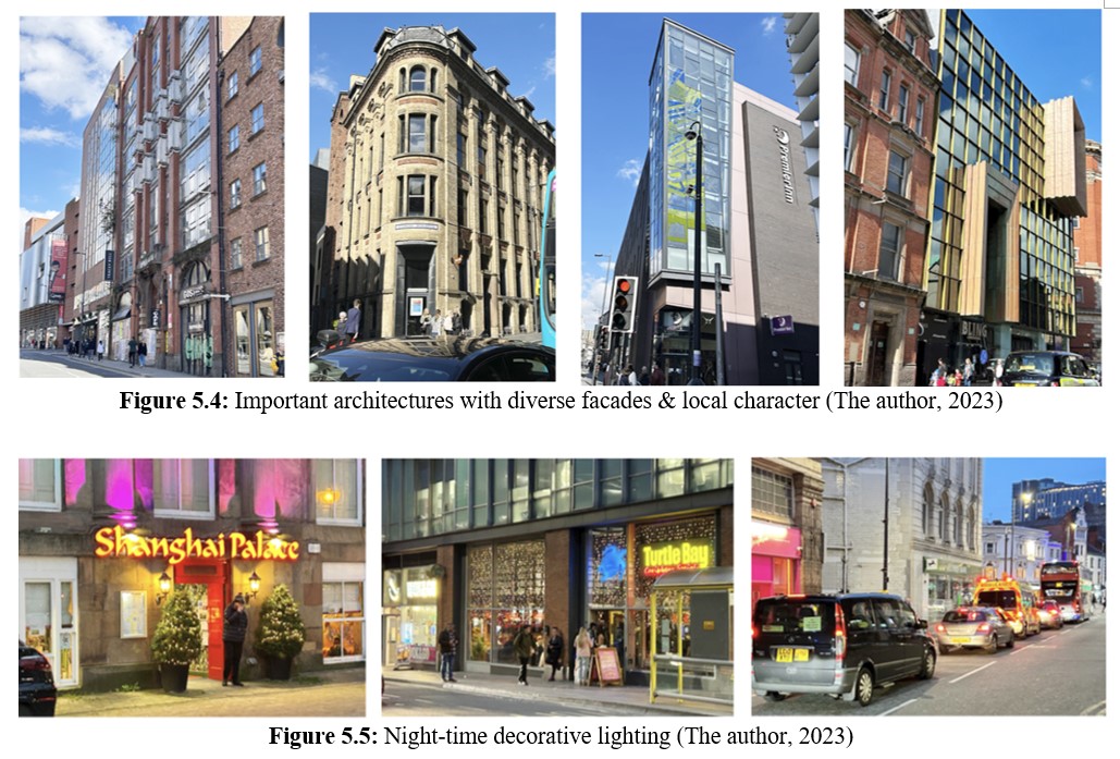 Appearance and Design: The distinct local character and unrivalled aesthetic values in Case 1 laid the foundation for its high vitality level. As noted by Yue et al. (2019) and Jacobs (1961), the juxtaposition of ancient and modern buildings constituted an appealing environment that motivated cultural diversity and the concentration of human flow. There were in total 13 Grade II-listed buildings, ranging from the former Handover House to the Ranelagh House. Cullen (1961) introduced the notion of "sense of place", highlighting how street aesthetics could create a distinct ambiance in a location and draw people to it. This was exemplified in Case 1, where its unique topography, diverse building facades and materials (Figure 5.4), permeable urban forms, and visual connections to local landmarks made the site highly legible and visually appealing. Green features and delicate street ornaments injected the public-private interface with more vibrancy (Ye et al., 2019; Liu, Jiang, and He, 2021). The streetlights were turned on before dusk, and the colourful decorative lights made the night-time environment safe and vibrant (Figure 5.5).
