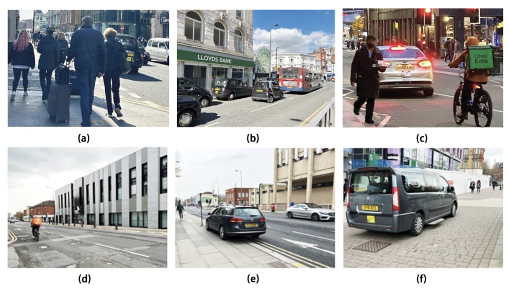 The new urbanism design guideline highlights that pedestrian-oriented streets tend to foster more interactions between buildings and street activities (Katz, 1994; Yue, Li, and Liu, 2017). In the three non-pedestrian streets studied, the intensity of human activities and movement was negatively impacted by fast traffic. These issues included limited sidewalk width (Figure 5.7a), long distances between pedestrian crossings, traffic congestion at intersections (b), lack of bike paths and other pedestrian facilities (c, d), insufficient roadside dropping areas leading to haphazard parking along the sidewalk (e), and direct vehicle access to the pedestrian path in front of the Monument Place Plaza in Case 3 (f), all of which posed significant safety concerns for pedestrians. These results appeared similar to Liu, Jiang, and He’s (2021) and Pikora et al.’s (2002) findings that streets designed for fast traffic are less attractive to pedestrians.