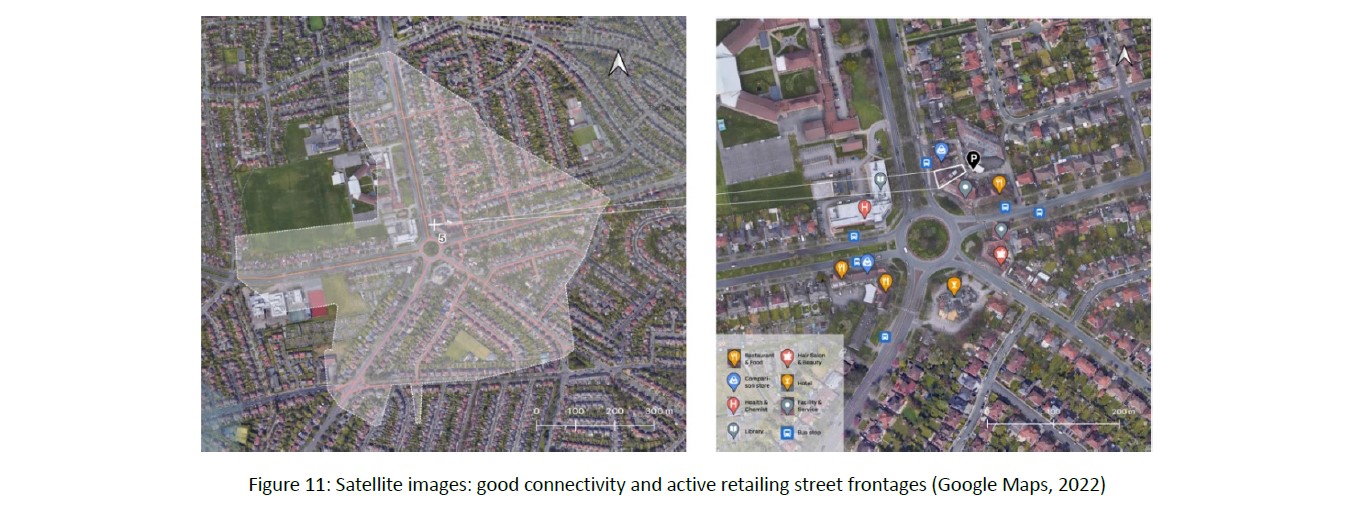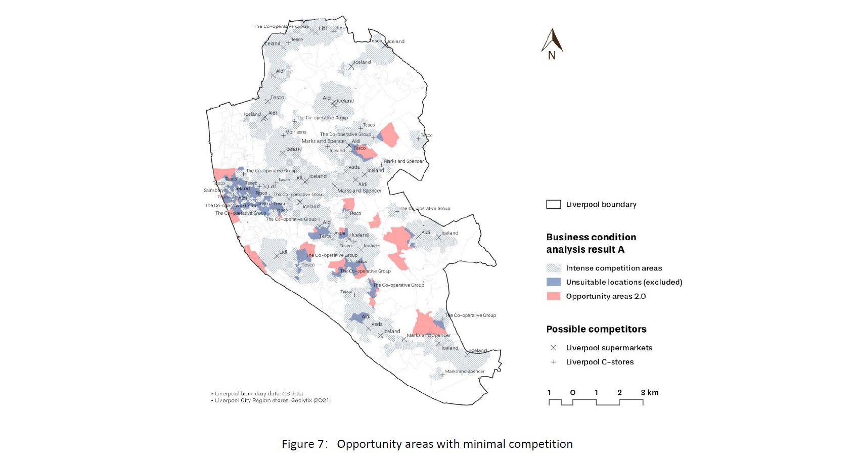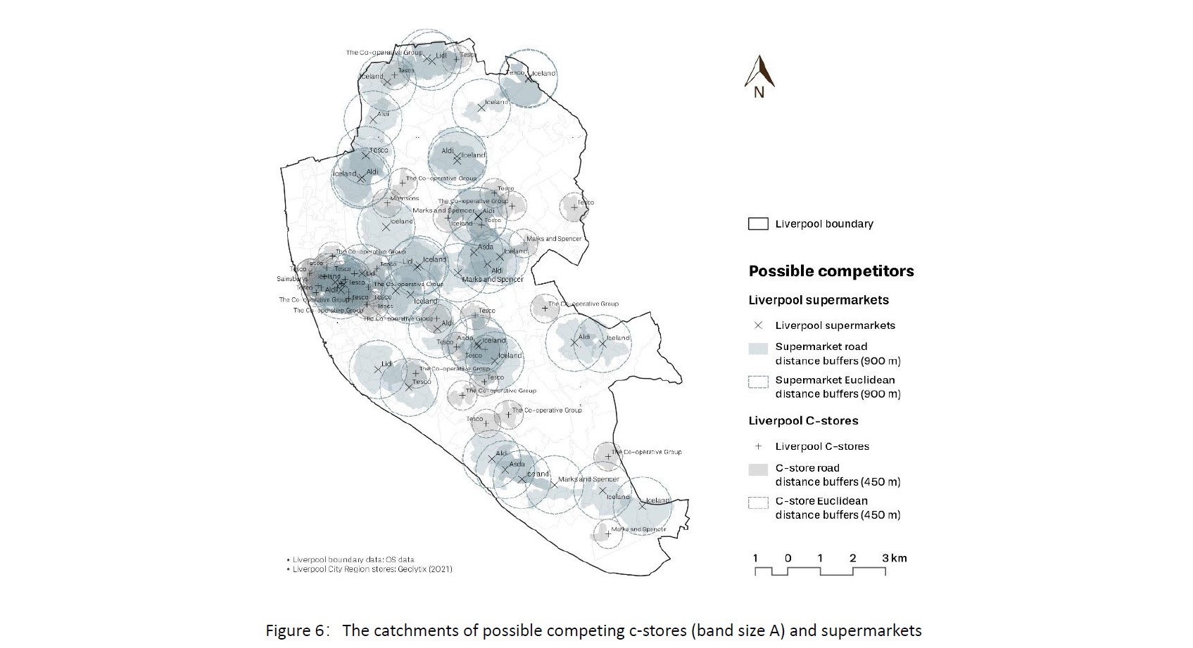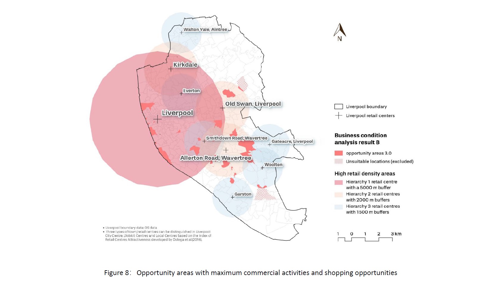 This step eliminates areas with little business prospects. Taking travel barriers into account (Thornton et al., 2012), road network buffers, rather than Euclidian distance, are used to exclude locations inside the catchments of perceived competitors (Figure 6-7). Also, locations outside the Liverpool retail centre buffers are dismissed, as retail agglomeration present more shopping opportunities to costumers (Figure 8; Eppli & Benjamin, 2020).
