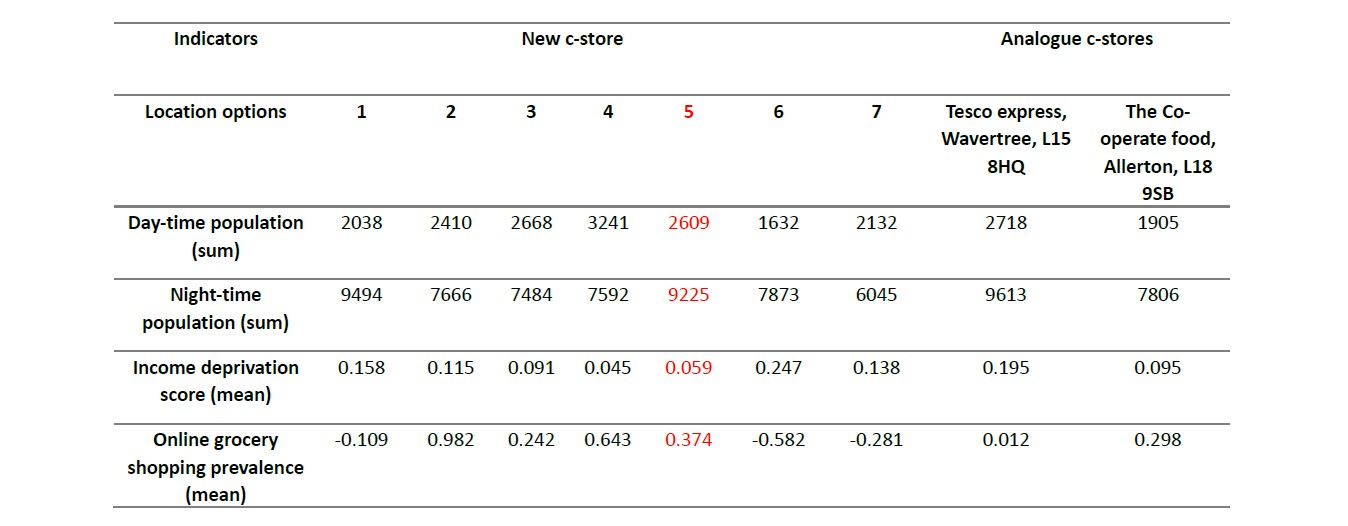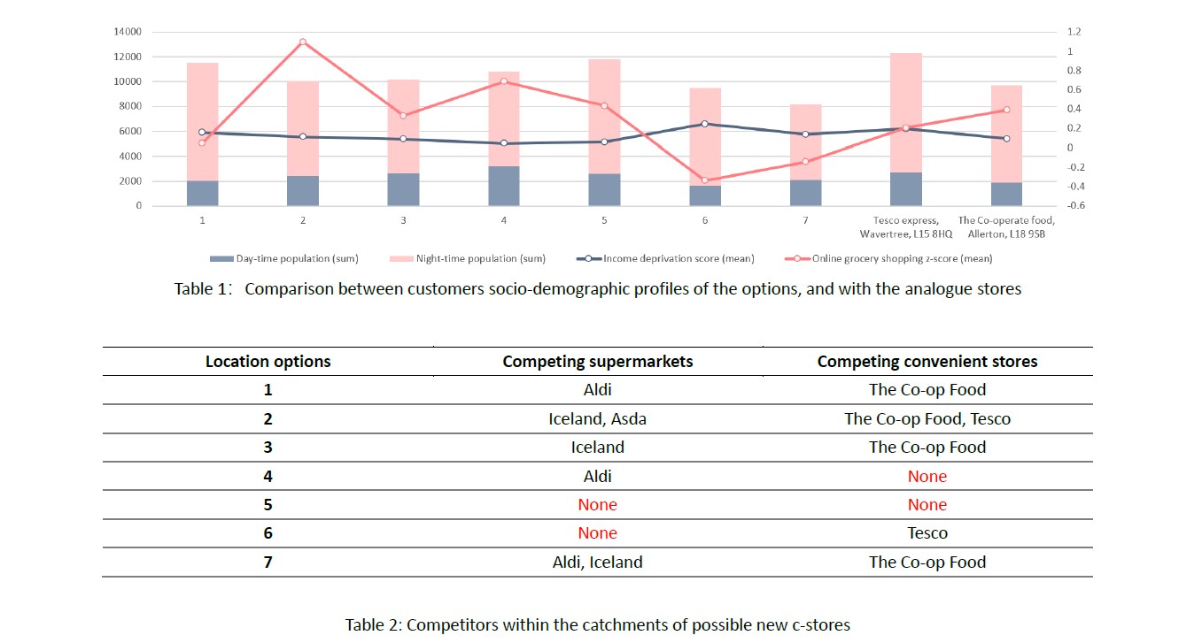 Two c-stores with click-and-collect services provide standards for evaluating social-demographic characteristics of the options' catchments (Figure 10). Option 5 not only contains the greatest footfall, the second-wealthiest populations, a relatively high online grocery shopping prevalence and the least competition among seven options, but also outperforms analogue stores on almost every indicator (Table 1 & 2).