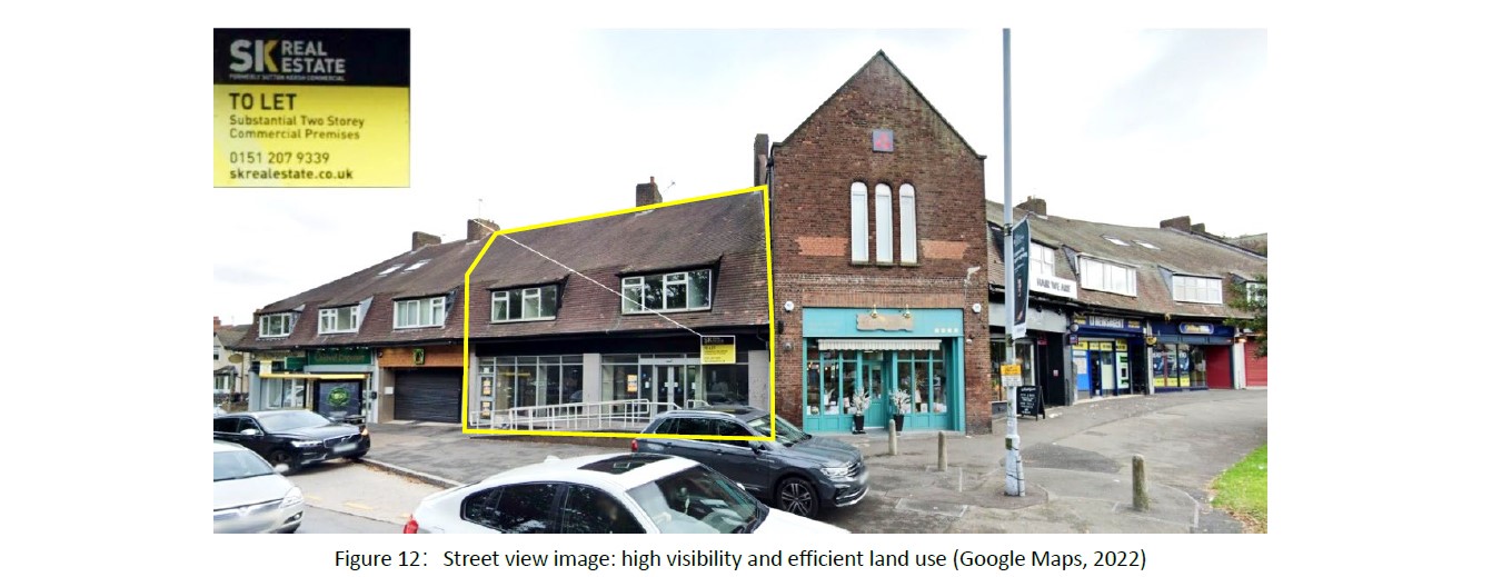 Option 5 (L15 6YB) is subject to site inspections recommended by Wood & Browne (2007). Surrounding parking and bus stops give this two-story shop easy access; the synergy of retailers along bustling and diversified street frontages provides it with massive customers (Figure 11, Karande & Lombard, 2005). The gable roof shown in Figure 12 demonstrates great visibility; the use of a vacant plot promotes efficient land use.